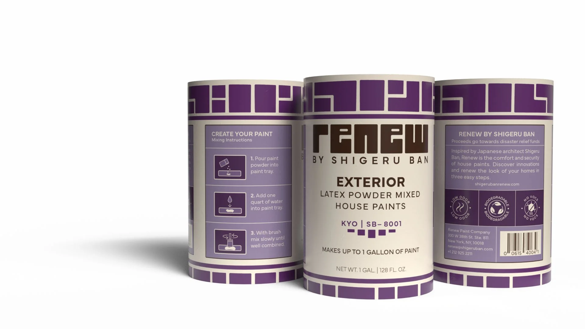 Create a sustainable powder paint brand and packaging that is inspired by Shigeru Ban, a Japanese architect.